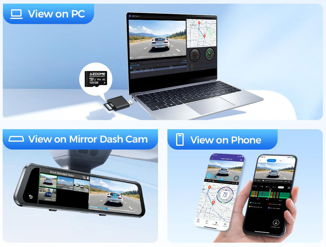 The AZDome PG17 Max Wifi Full Mirror comes with a 64GB Micro SD card. This allows for approximately 6 hours of filming in Full HD. The camera supports Micro SD cards up to 256GB.