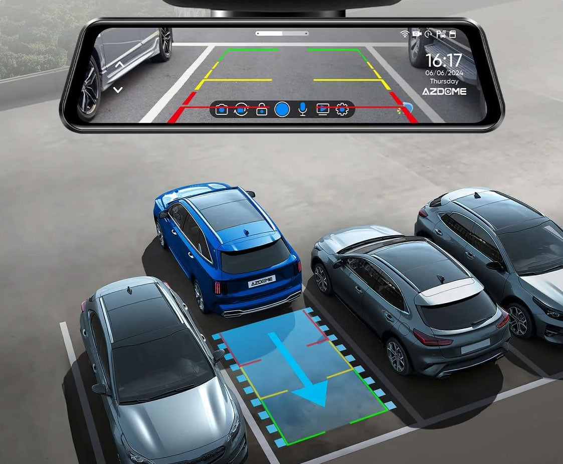Thanks to its handy design and rear camera, the AZDome PG17 Max Wifi is also ideal for use as a parking aid when parking. The rear camera comes with an extra cable that can be connected to the power supply of the reversing light. When the car is put into reverse, the rear camera automatically displays a large image on the screen, together with parking aid indicators.