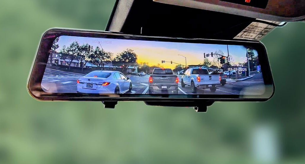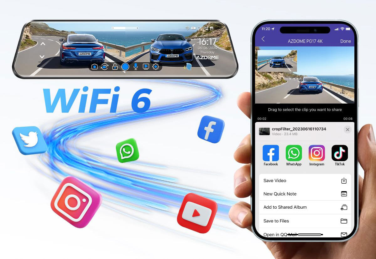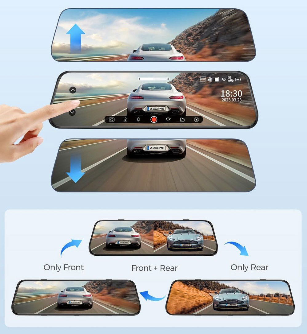 The AZDome PG17 Pro Wifi is a uniquely designed 2CH dashcam that can be placed over any rear-view mirror using the rubber brackets supplied. Its large 12-inch touchscreen LCD screen makes it a high-quality digital rear-view mirror. The rear camera is displayed completely and very clearly on the large screen, and with a single swipe on the screen, you can switch between the front and rear cameras.