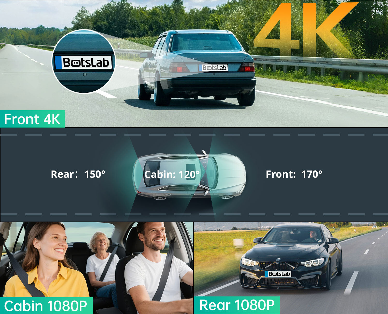 The Botslab G980H Pro 3CH takes great recordings using Sony image sensors. These super powerful sensors guarantee the sharpest images and are unrivalled, especially in the dark. The videos are recorded in 3K resolution at the front and Full HD for the interior and rear.