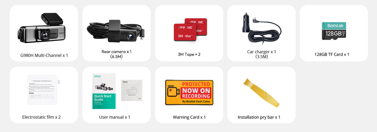 This G980H Pro 3CH comes with a 128GB Micro SD card, good for approximately 8 hours of 3K + 3x FullHD recordings. It supports Micro SD cards up to 256GB, which can store approximately 16 hours of footage.