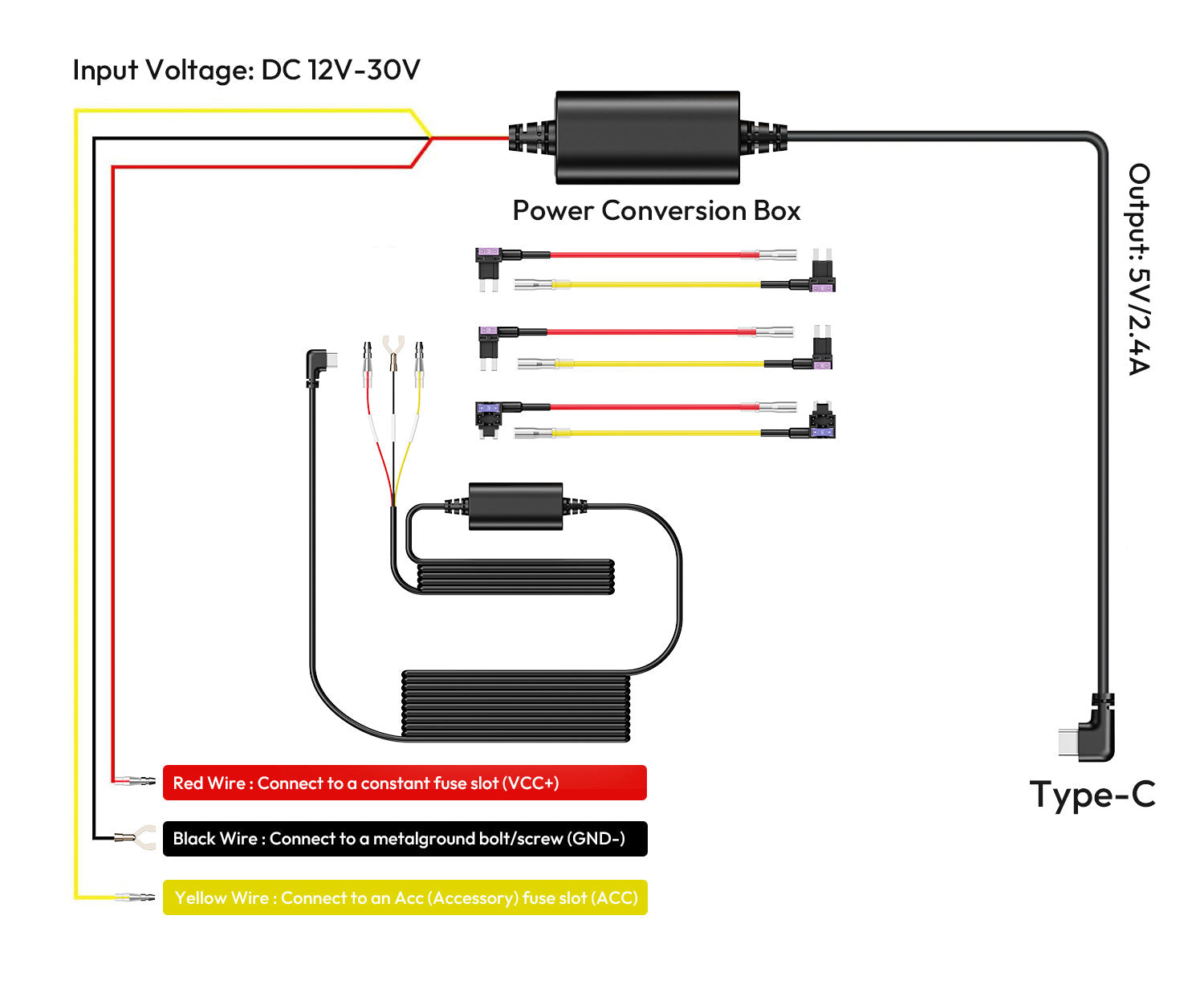 This Botslab hardwire kit USB-C 3-wire is an intelligent power supply for all Botslab dashcams with a USB-C port (HK30 Pro, G500H Pro, G980H Pro, V9H etc.). This power supply can be connected to the car's fuse box to provide the dashcam with power when the ignition is off. The Botslab power supply comes with all four types of fuse holders, making installation very easy and safe.
